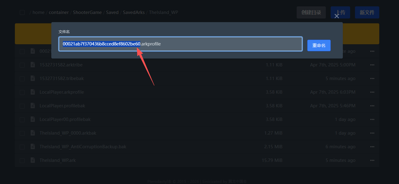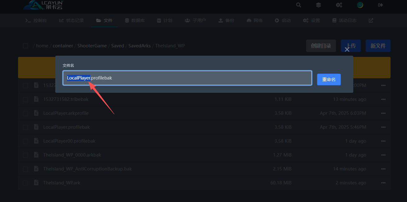 接着将上面说到的LocalPlayer.arkprofile文件重命名为你复制的名称(只改前面的LocalPlayer)