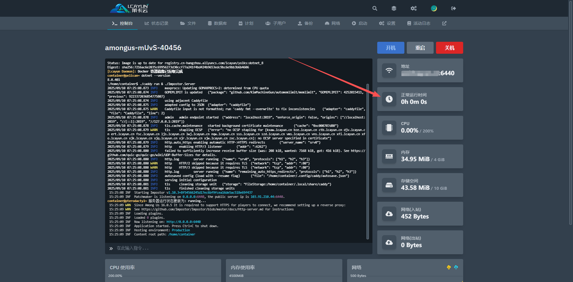 然后请查看地址下方的正常运行时间,如下图👇,表为有三种颜色,区分--红色:关机,黄色:正在启动,灰色:启动完成