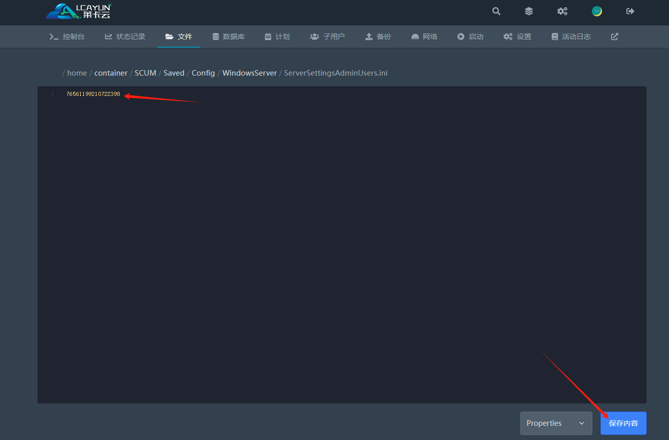 将你的Steam64位ID填写到ServerSettingsAdminUsers.ini文件里(要记得保存内容)