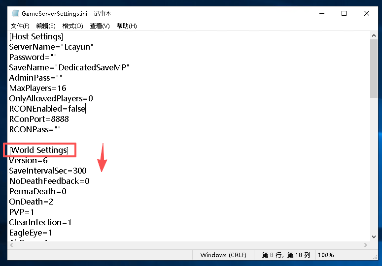在文本中 [World Settings] 往下的都是服务器的参数