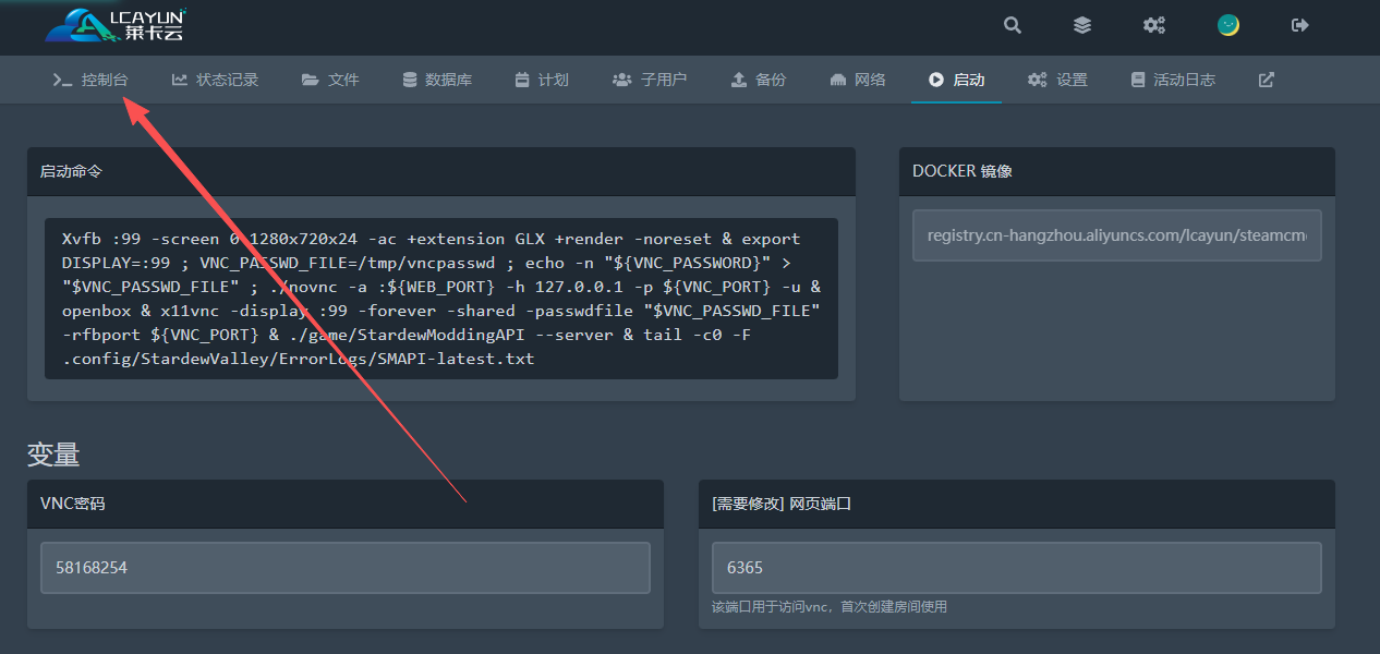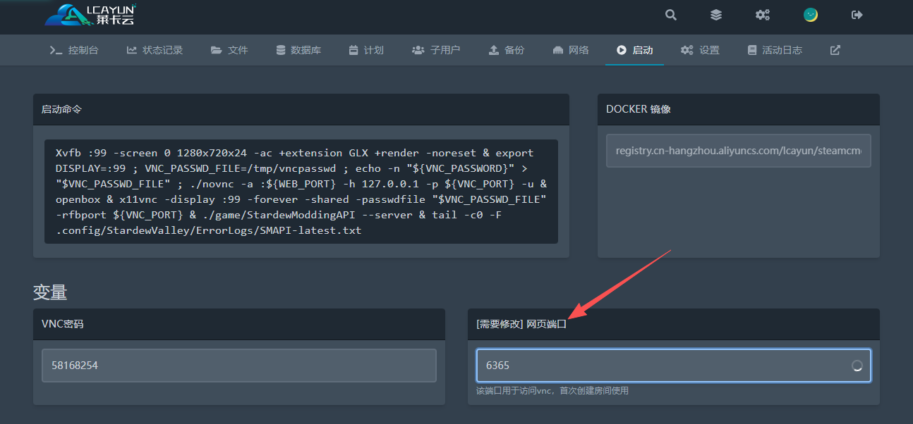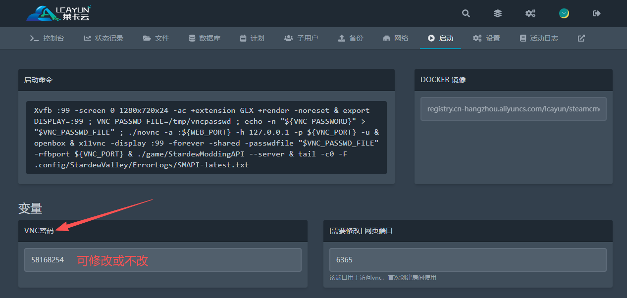 在网页端口的左边有一个【VNC密码】变量框,你可以自定义你的VNC密码或保持58168254