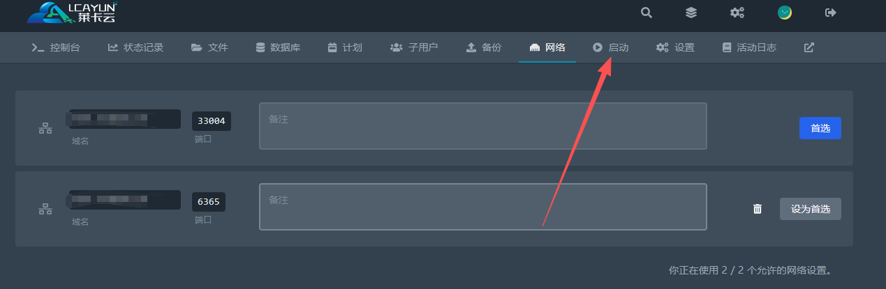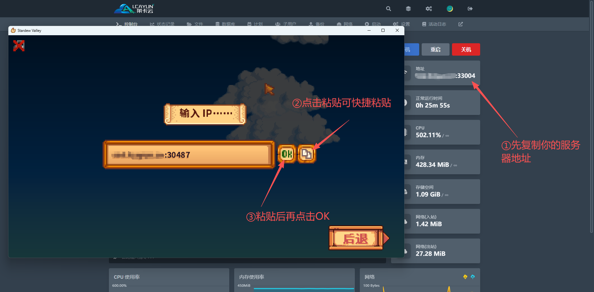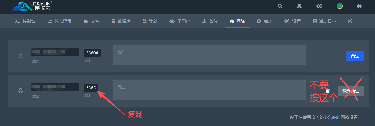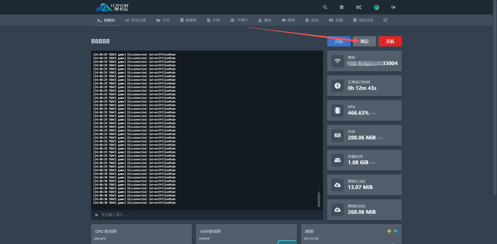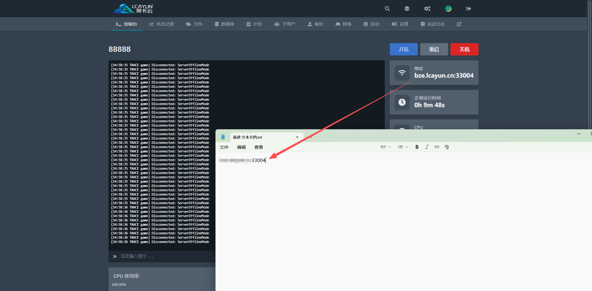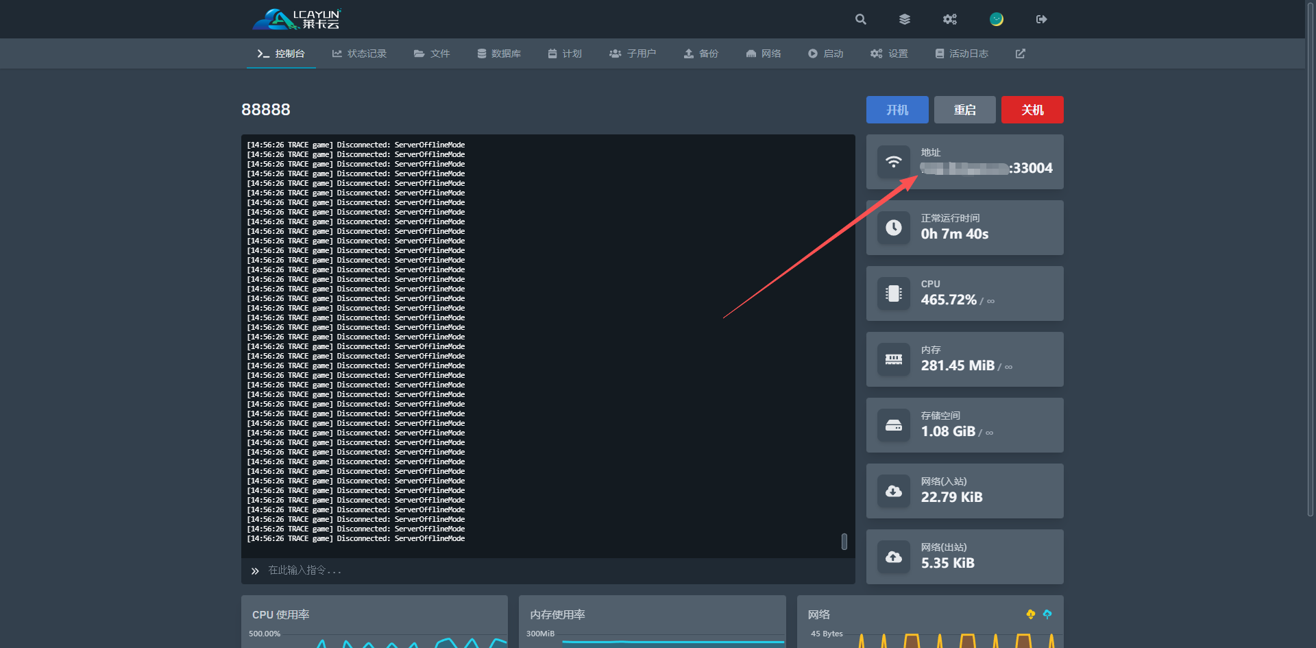 服务器地址英文部分在控制台页面的开机按键下方,点击即可复制