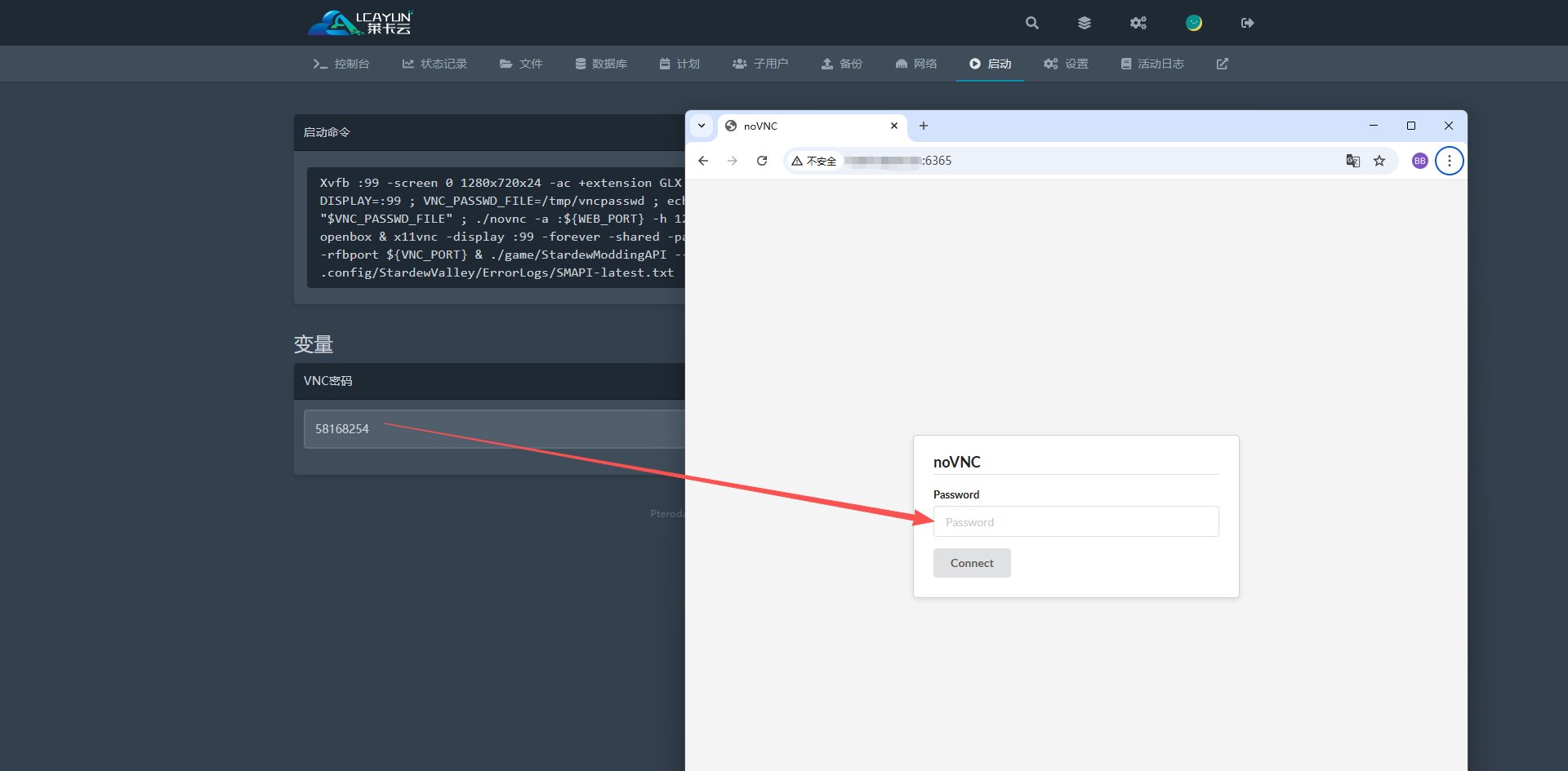 访问后,会要求你输入密码,将你在启动页面设置的VNC密码填进去,如果没有修改默认就是58168254