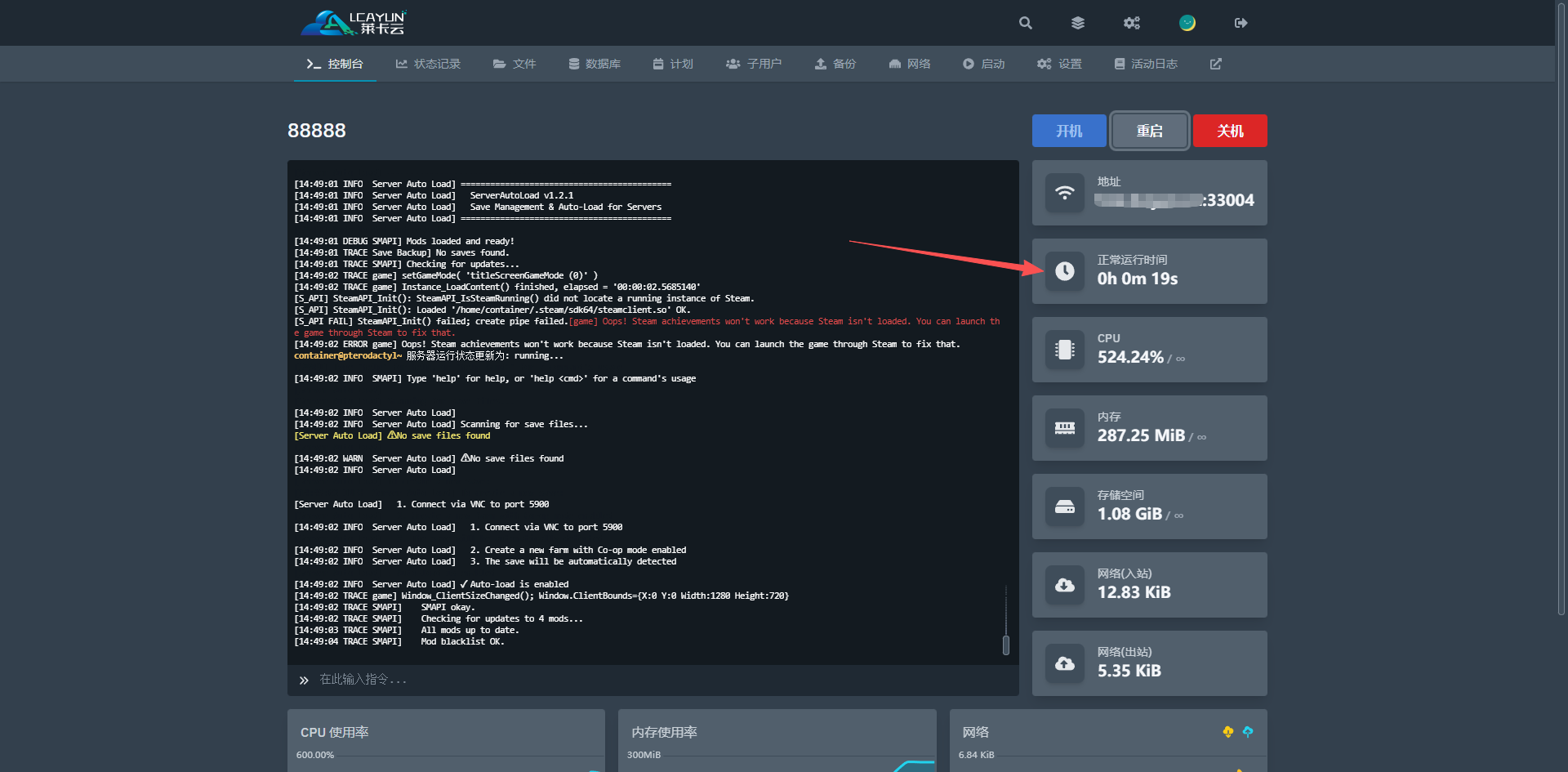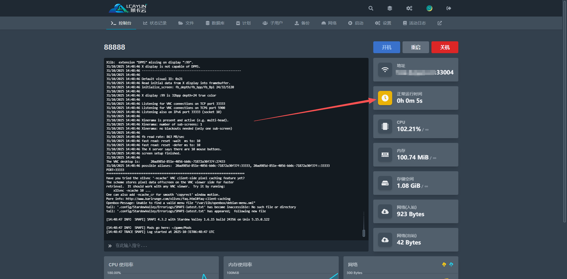 确认服务器运行状态,以正常运行时间的表为准,红色代表关机,黄色代表正在运行,灰色代表运行完成