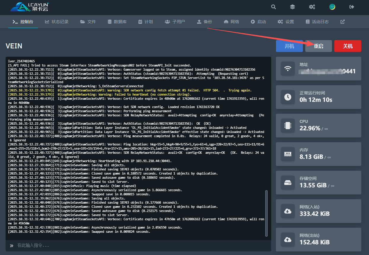 在你的莱卡云账户左侧栏目中点击产品服务,再点游戏服务器,再选择你的服务器点击操作