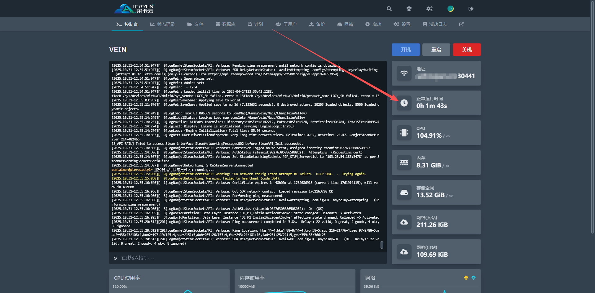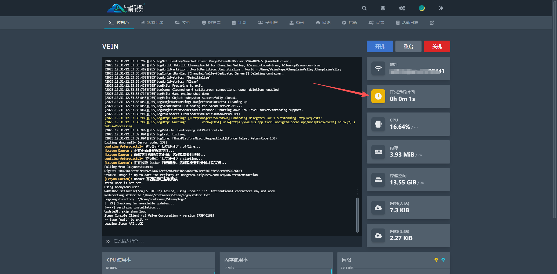 确认服务器运行状态,以正常运行时间的表为准,红色代表关机,黄色代表正在运行,灰色代表运行完成