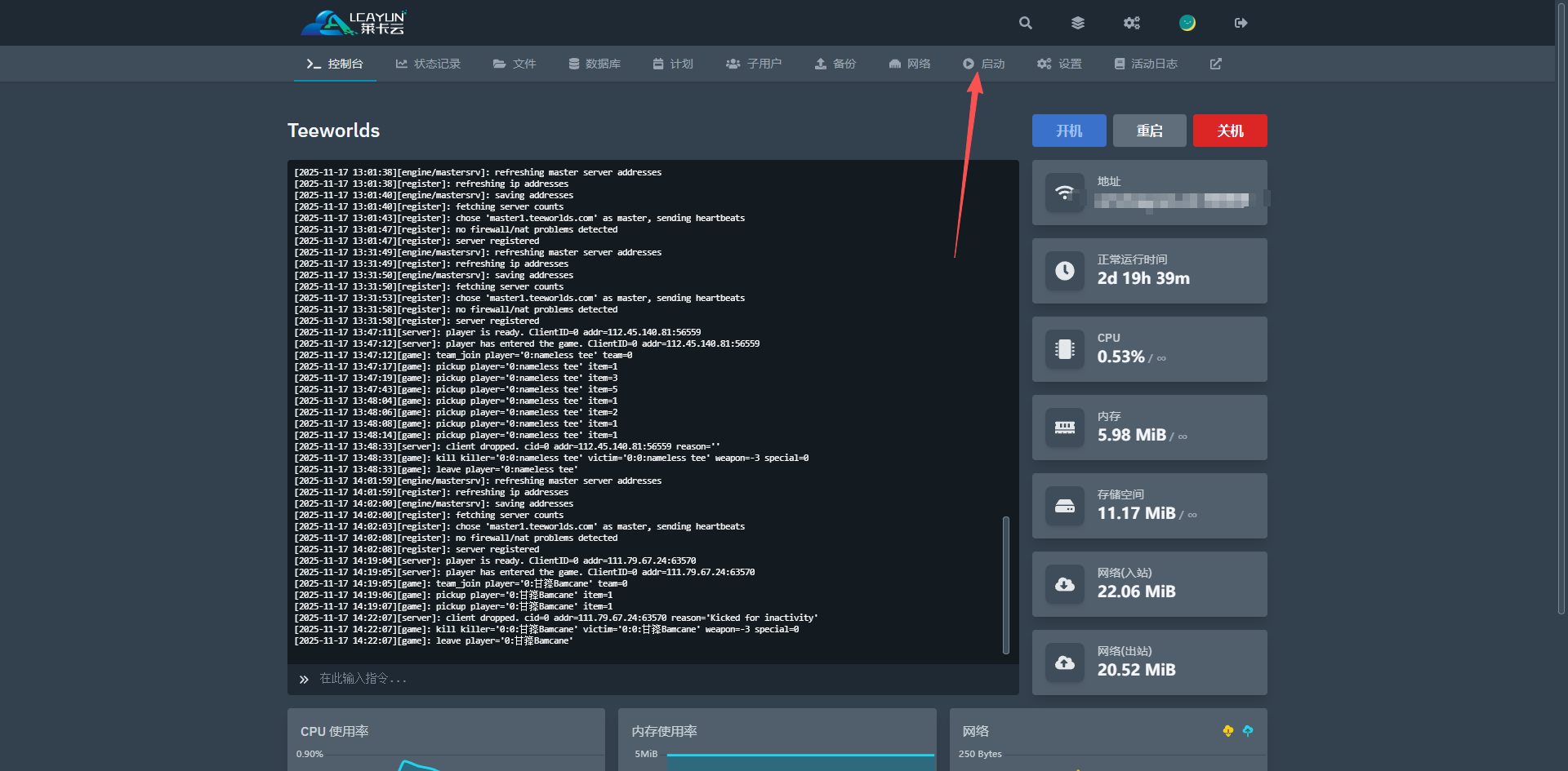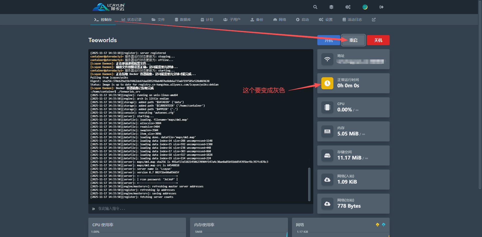 注意:一定要等待【正常运行时间】这个表的颜色变成灰色服务器才算运行完成