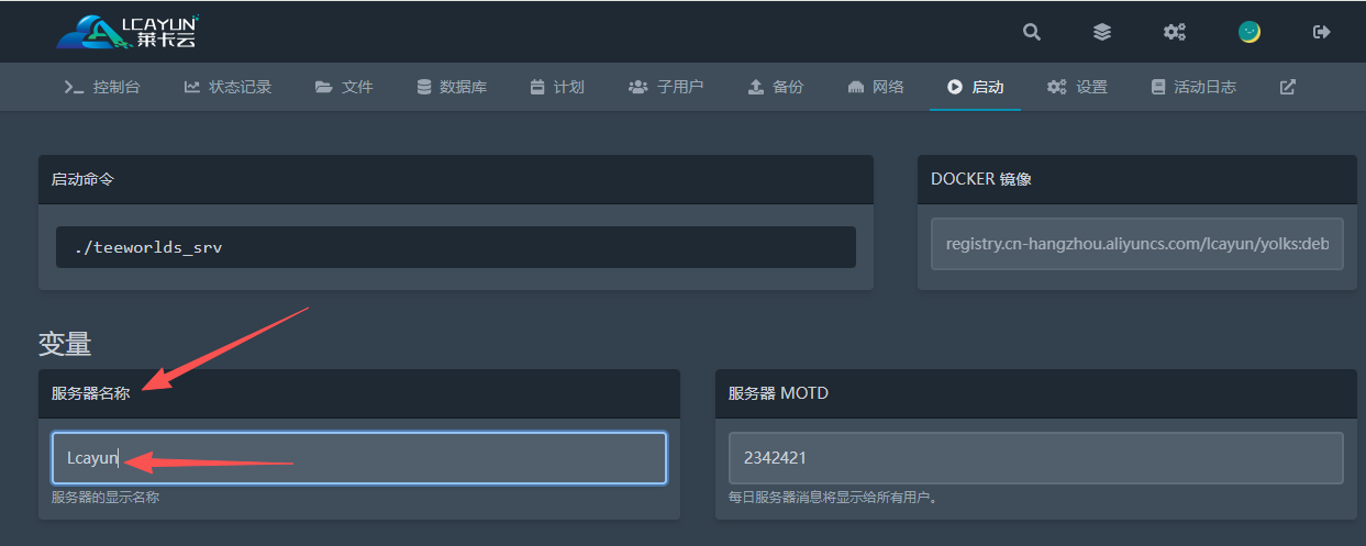 在启动页面中找到【服务器名称】变量框,并将你想要的服务器名称填进去