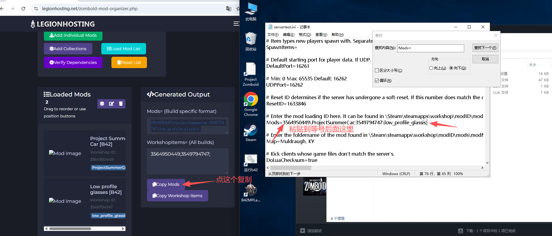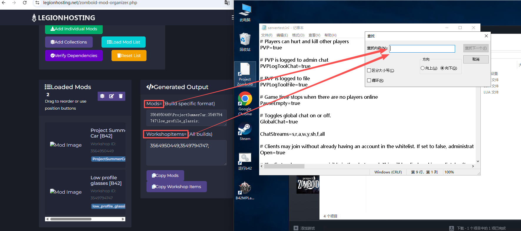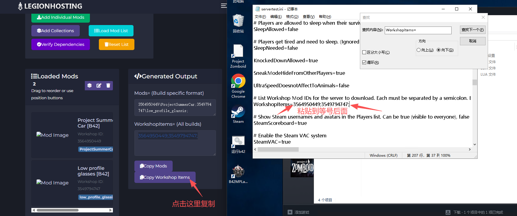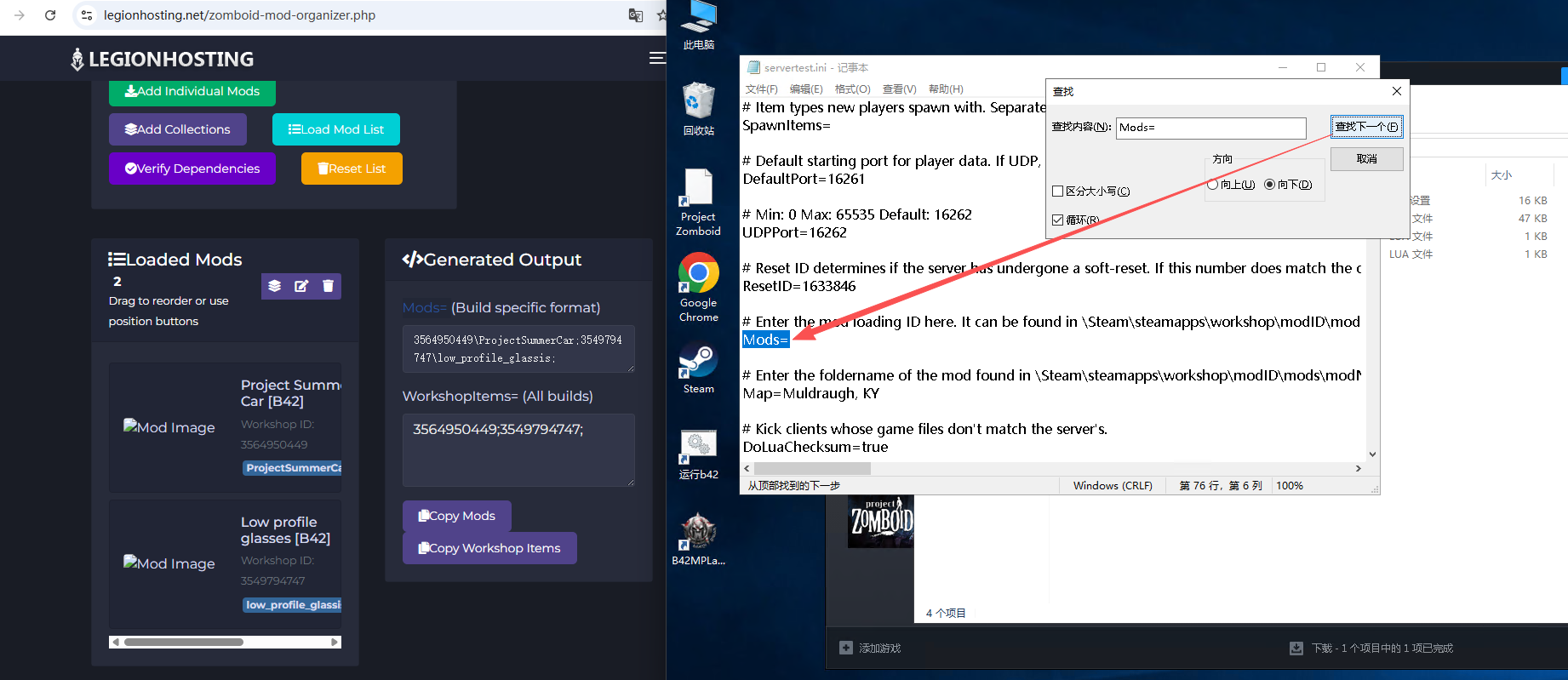 然后查找【Mods=】和【WorkshopItems=】,分开一步一步来,请往下看