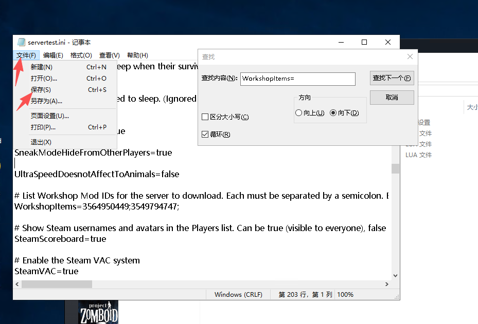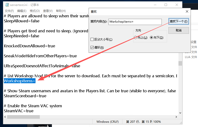 再查找【WorkshopItems=】,点击查找下一个之后会自动标识出来