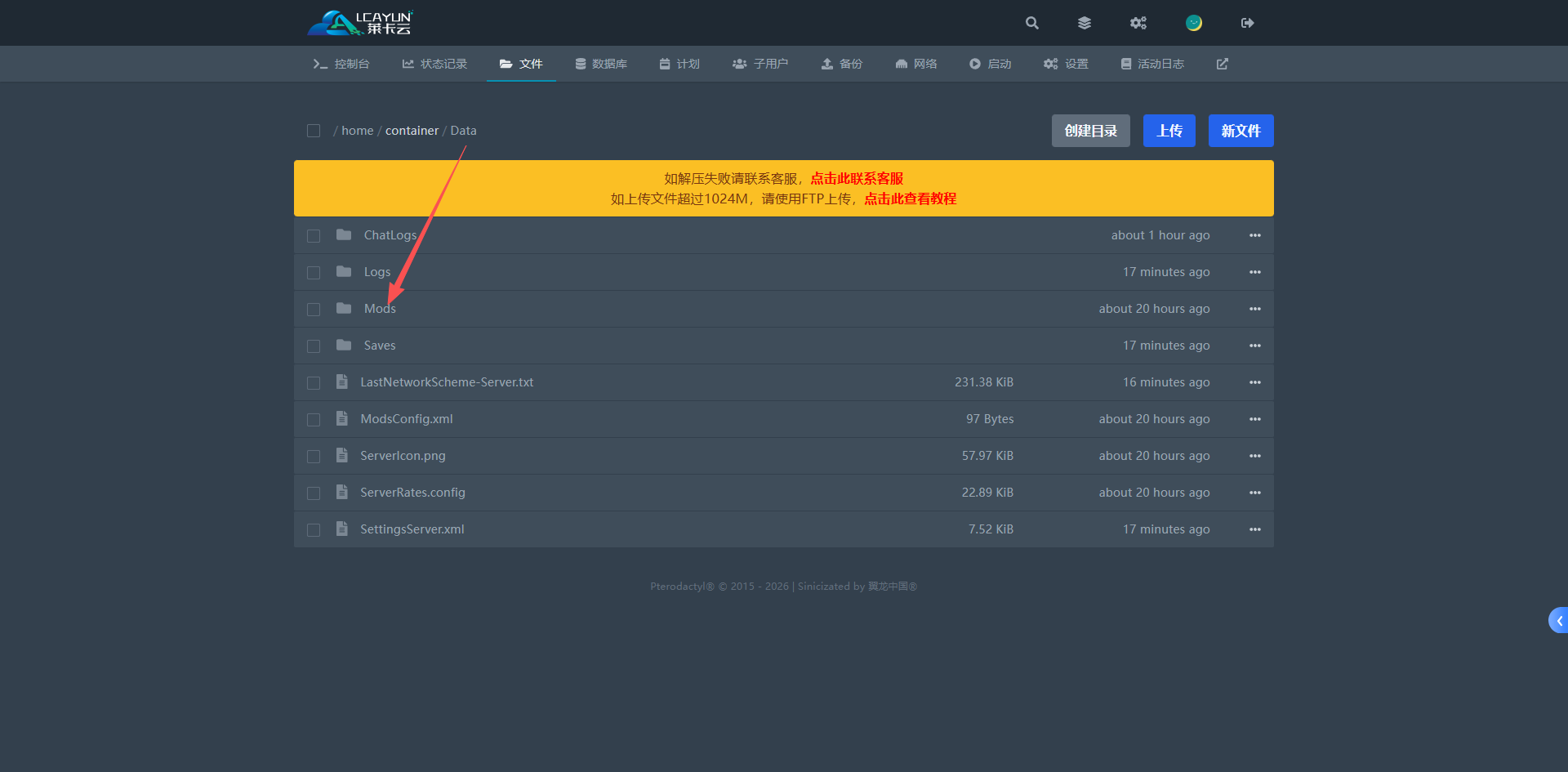 在Data打开Mods文件夹,并将将你的模组文件上传到Mods文件夹里面