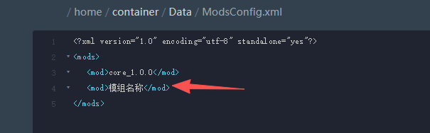在<mod>core_1.0.0</mod>下面新建一行添加这段内容👉【<mod>模组名称</mod>】如下图👇多个模组就多建几行