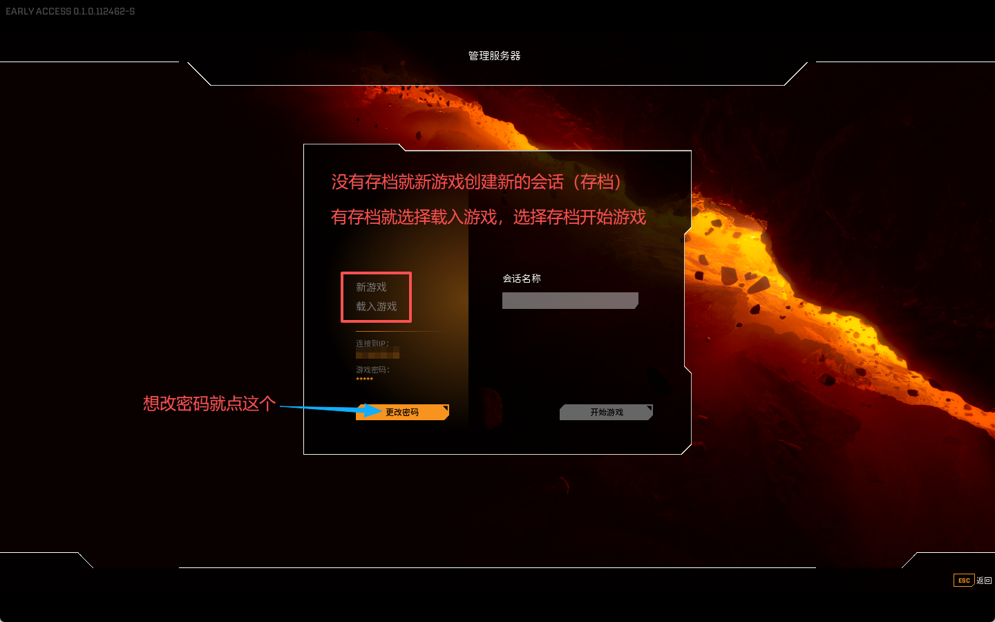 填完密码就会进入一个简单的界面,你可以在这里选择存档开始游戏或新建存档,也可以修改玩家连接服务器的密码