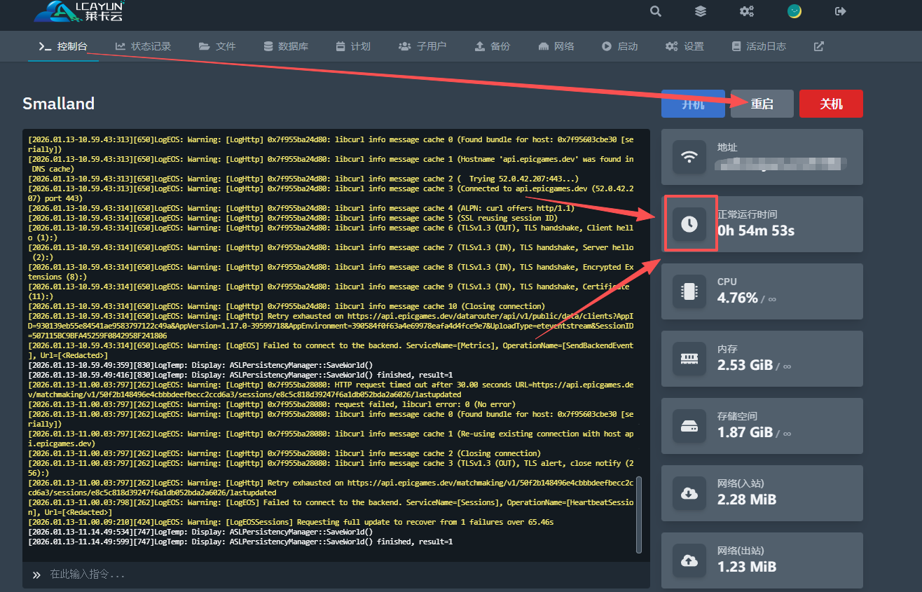点击上方目录中的控制台,在控制台页面点击重启按键,重启服务器来读取新的数值