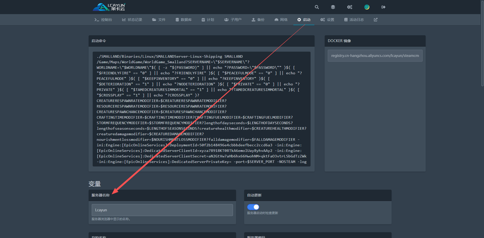 在你的服务器后台中点击上方目录中的启动,在启动页面找到服务器名称变量框,将你想要的服务器名称修改进去(不可以使用中文)