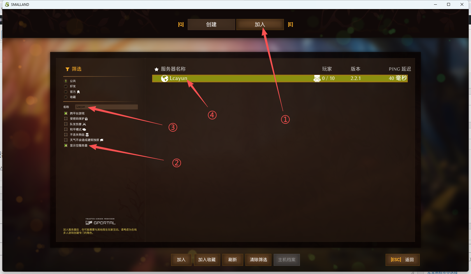 ①点击正上方的加入➡②勾选显示空服务器➡③输入你设置的服务器名称➡④双击你的服务器即可加入游戏
