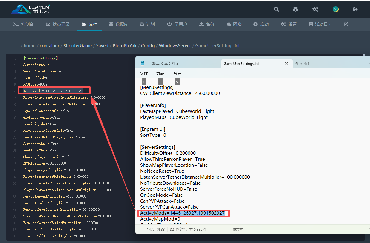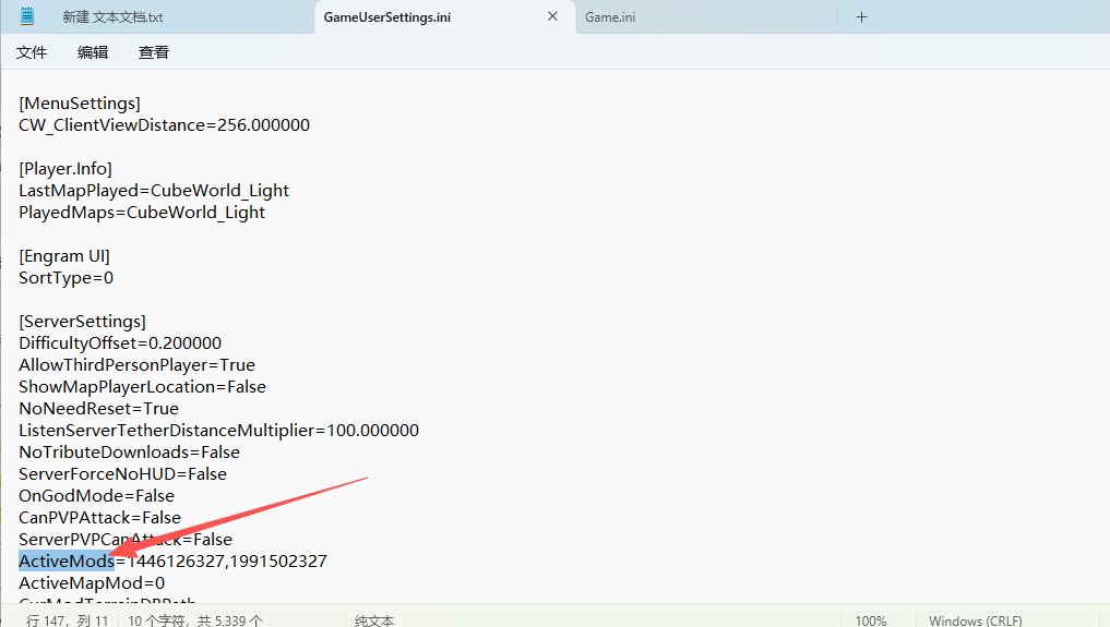 在【GameUserSettings.ini】内找到参数【ActiveMods】