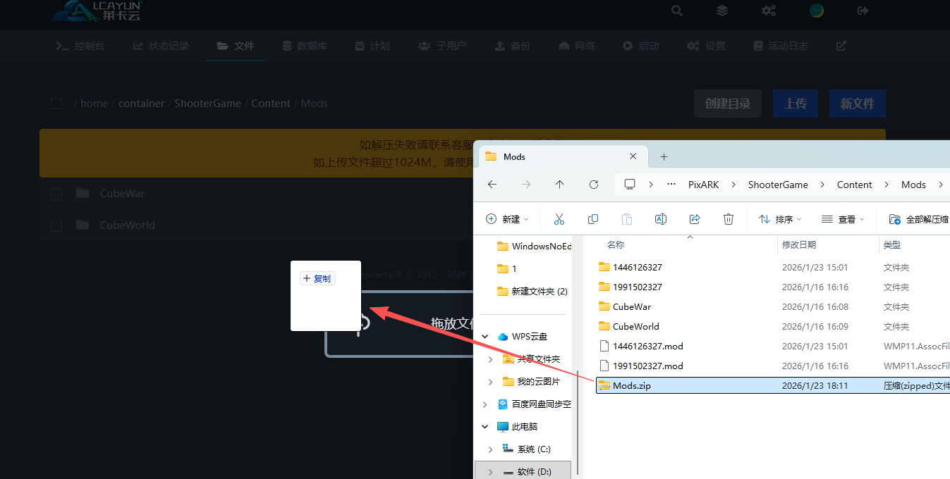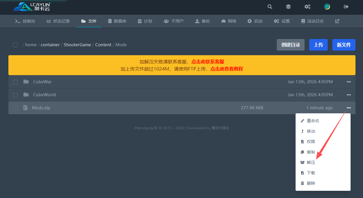 将你压缩的模组文件压缩包上传到【Mods】文件夹里