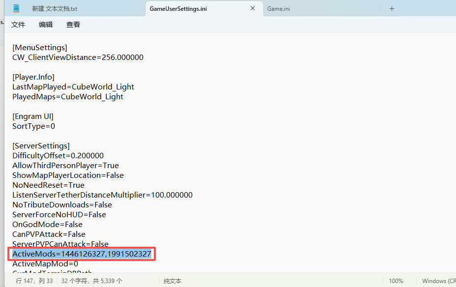 将你电脑上复制的整段参数【ActiveMods】粘贴到【[ServerSettings]】下(记得保存文件)