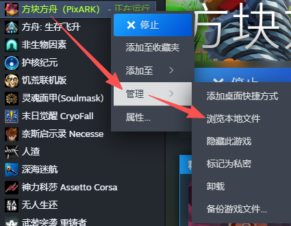 接着再右键你steam里的方块方舟游戏➡鼠标移至管理➡选择浏览本地文件