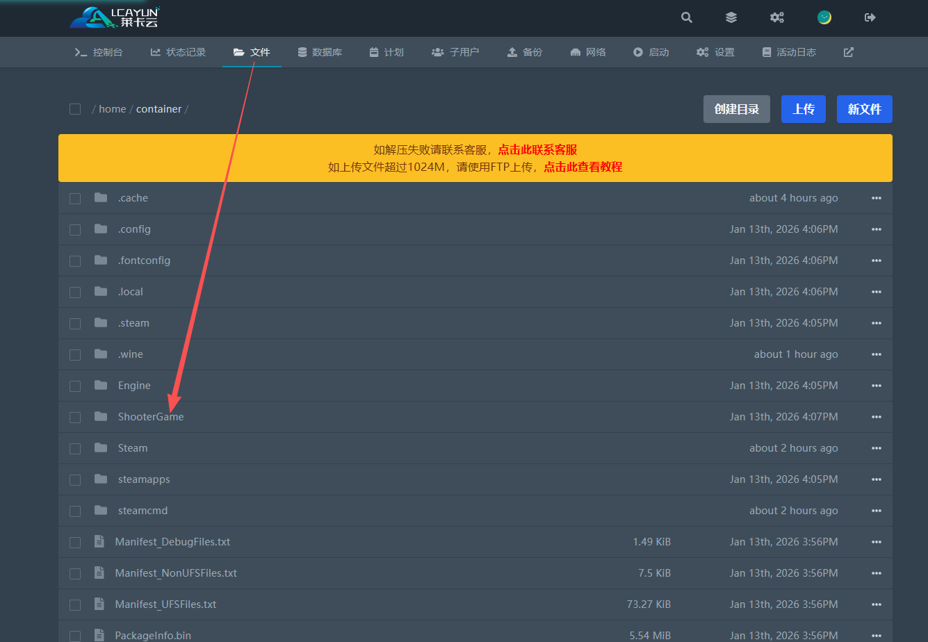 接着在服务器后台中点击文件,并从【ShooterGame】文件夹开始,根据以下路径顺序打开【Mods】