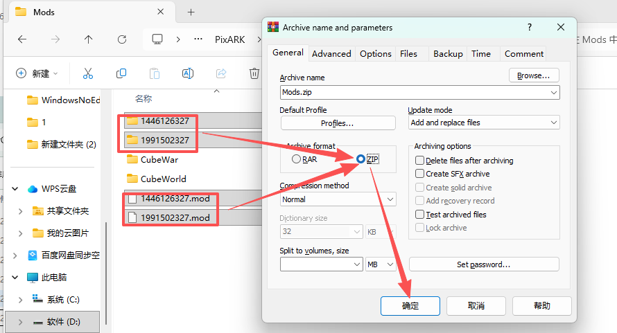 到这里,你想玩哪个模组就选中该模组文件夹和模组ID.mod文件并右键他们进行压缩成ZIP格式的压缩包