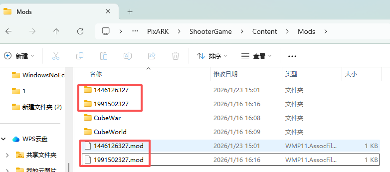 在Mods文件夹里会有你订阅的模组文件夹(模组文件夹以模组的ID为名称)和【模组ID.mod】文件