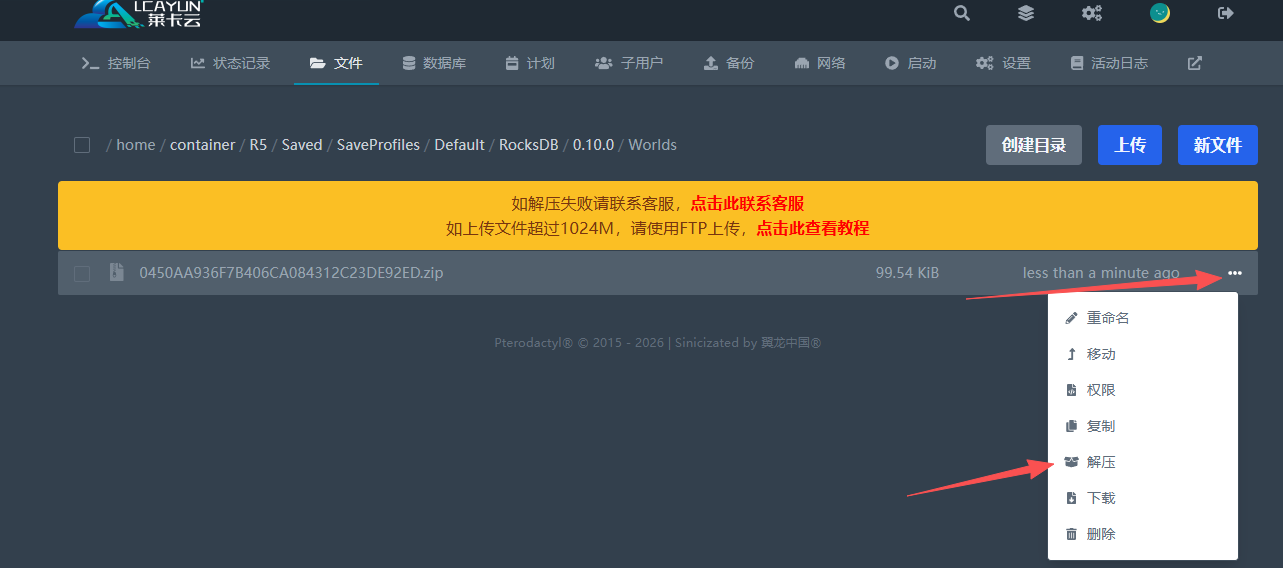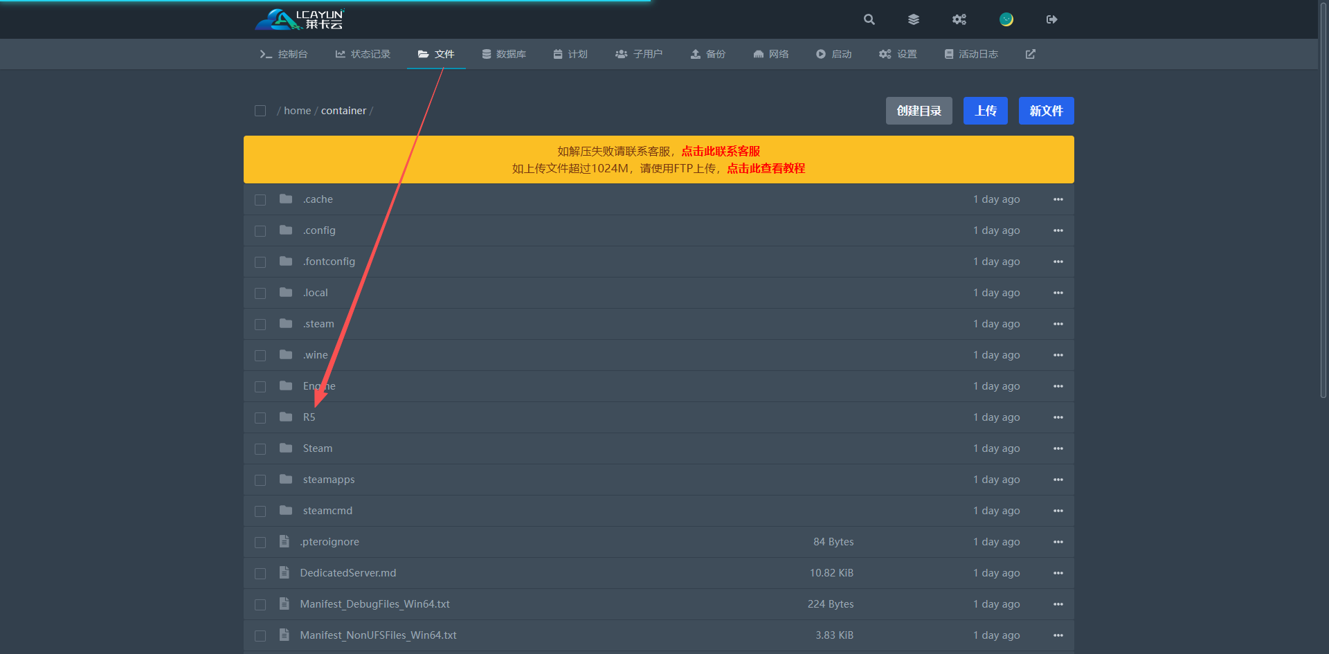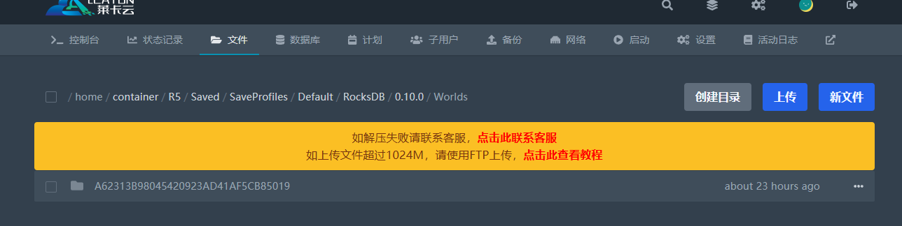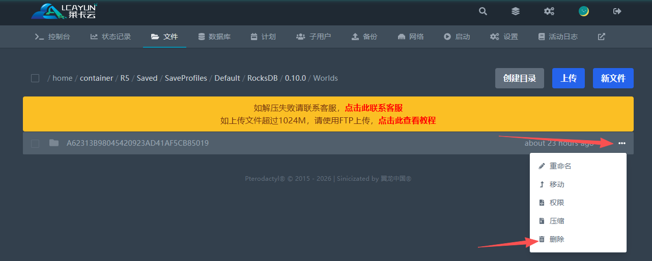接着删除服务器内原有的存档文件夹(如果你需要保留该存档,你可以先将其压缩一份,然后下载压缩包)