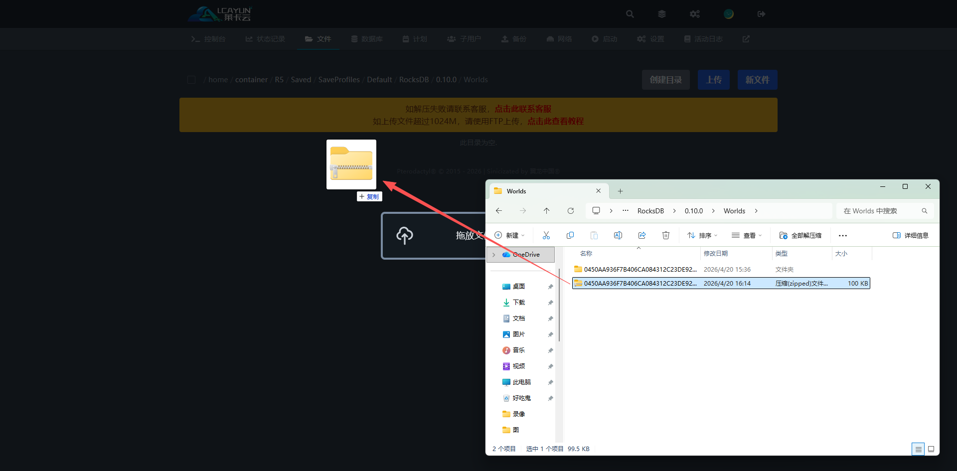 删除服务器原有的存档后,再按住你压缩的存档文件夹压缩包拉到服务器里进行上传